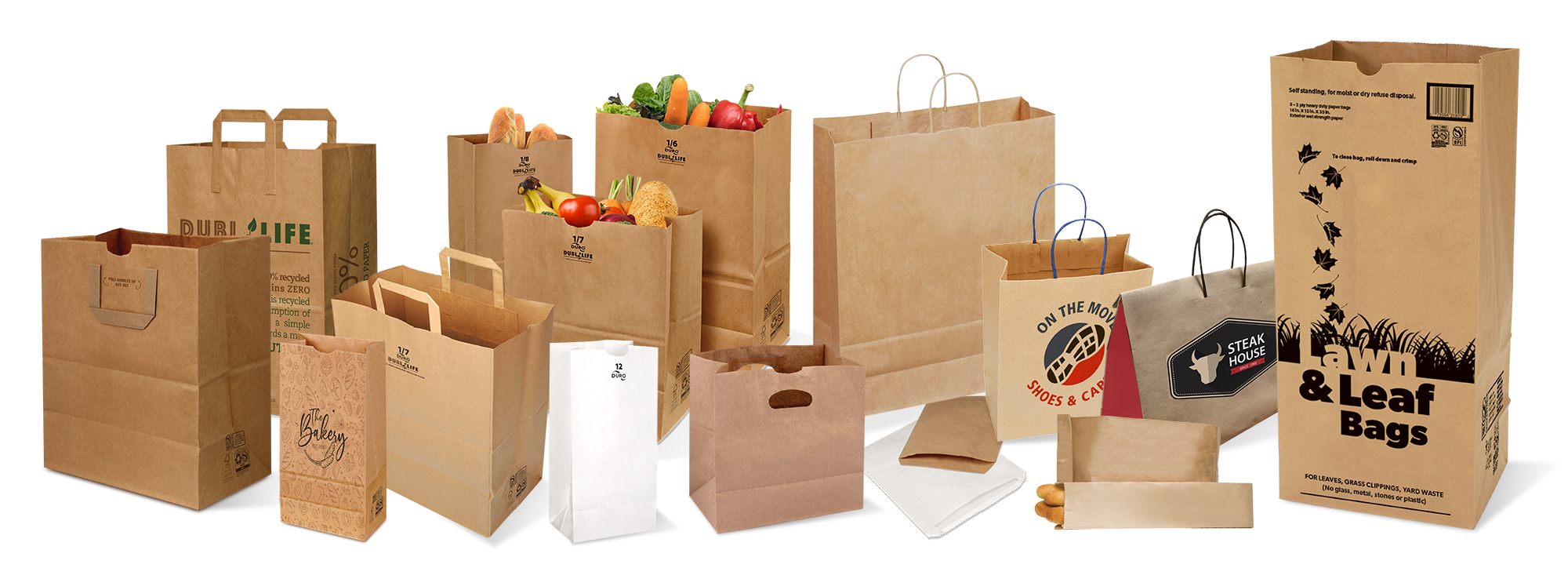 Shopper style bags ideal for restaurant takeout. Duro shoppers offer a variety of shapes and sizes for all your foodservice needs. Available in natural kraft or virgin white paper.