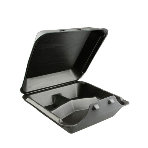 Sysco Trendz 9 x 9.5" PS Foam SmartLock 3-Compartment Hinged Lid Container, Black, 150 ct.